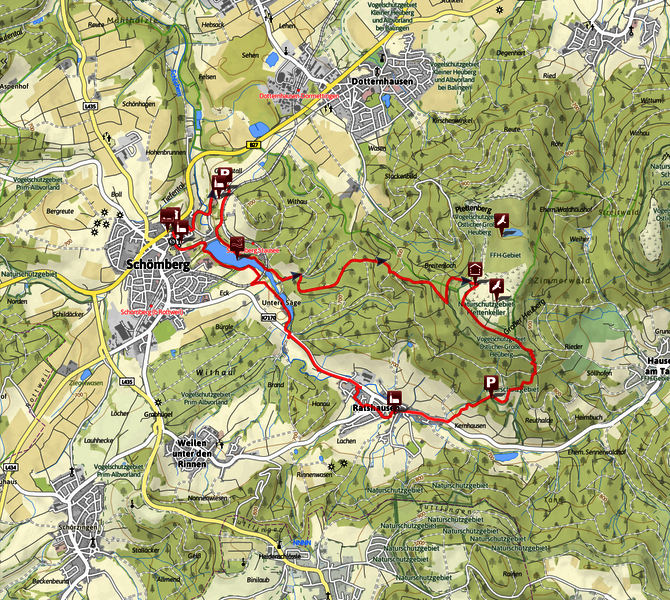 Landschaftlich abwechslungsreiche Tour mit geringen Höhenunterschieden. Die ersten Kilometer verlaufen entlang der Schlichem auf dem Schlichemwanderweg. Einkehrmöglichkeiten gibt es in Schömberg und Dautmergen und einem Grillplatz bei Täbingen. Geschichtlich interessant ist die KZ-Gedenkstätte. Möglichkeit zu einem Abstecher „Schiefererlebnispark“.